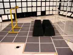 Above is a 10 meter semi-anechoic chamber. The walls are covered with materials that absorb radio-frequency energy, reducing unwanted reflected signals. The floor is metallic, to reflect signals on purpose. Both emission and immunity tests can be done in this chamber, although some ferrite tiles must be placed on the floor for immunity testing.