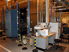 Above is another shot inside the 10 meter chamber. In this picture, the chamber is configured for a radiated immunity test. The antenna on the left, a dual-ridge horn antenna, is used for the frequency range from 1 to 10 GHz. This picture was taken after a calibration was performed to IEC 1000-4-3 specs. The white PVC rack on the right is for holding the field probe at the 16 positions needed for calibration purposes. The combination of ferrite tiles on the floor and the cones on top of the tile help to reduce reflections of the signals off of the floor. This helps to insure a uniform field strength at the various probe positions. During an actual test, the probe and probe rack will be replaced by the equipment-under-test (EUT). As with the triplate test, the product will be observed/monitored during the test for proper operation.