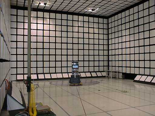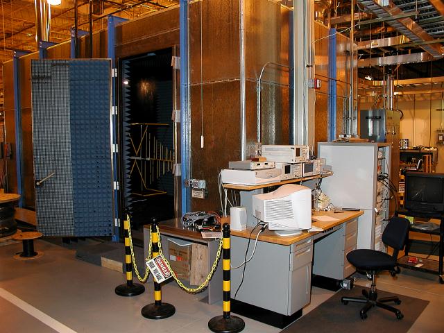 Above is a 10 meter semi-anechoic chamber. The walls are covered with materials that absorb radio-frequency energy, reducing unwanted reflected signals. The floor is metallic, to reflect signals on purpose. Both emission and immunity tests can be done in this chamber, although some ferrite tiles must be placed on the floor for immunity testing.
