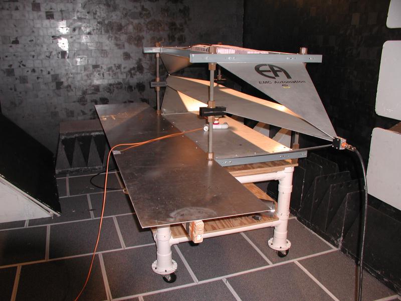 Above is a tri-plate, used for RF immunity testing of small devices. It is shown inside a compact anechoic chamber. The tri-plate is used primarily for testing automotive components. This picture was taken during calibration. The field probe can be seen under the septum (middle plate) with the fiber-optic cable running from the probe to the computer outside the chamber. During an actual test, the device-under-test (DUT) is placed under the septum along with part of the wiring harness associated with the device. A camera is used to monitor the device during the test to observe it for proper operation. There might also be equipment outside the chamber to exercise/monitor the device. A computer is used to operate the amps, signal generator, and power meters needed to control the test. A large RF field is generated between the septum and the outer plates, covering the frequency range from 10 kHz to 1000 MHz.